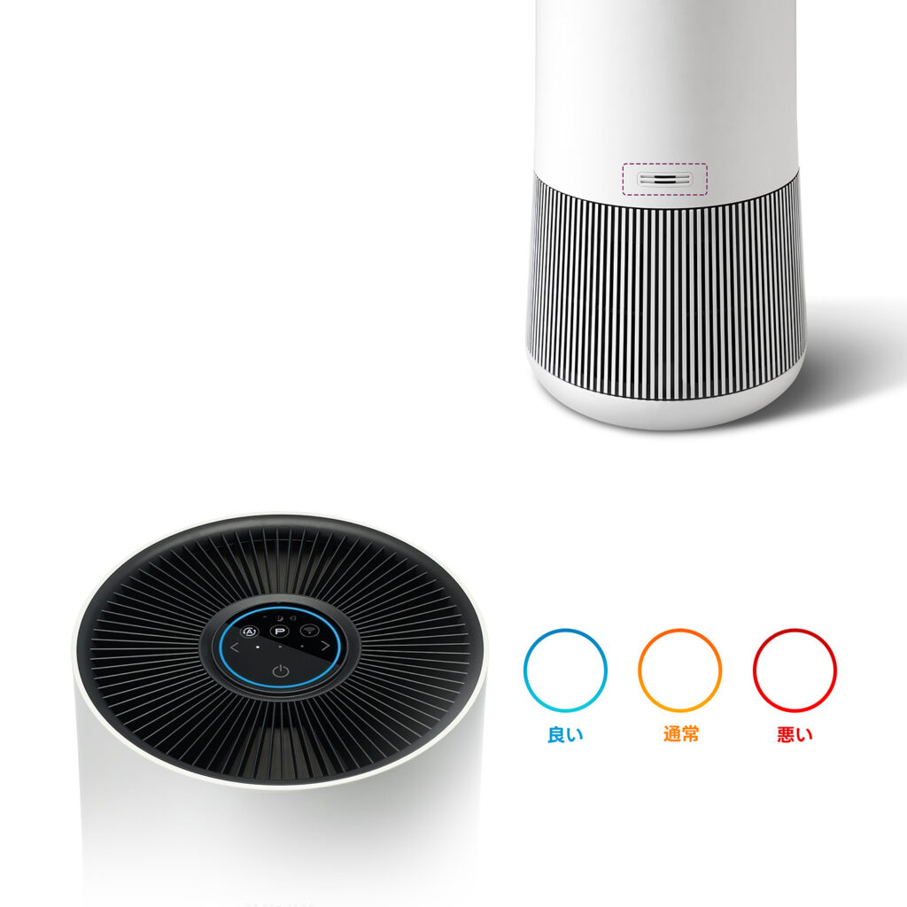 内蔵センサーが空気の状態を常に監視し、Autoモードでは汚れの程度に応じて風量を自動調整します。LEDインジケーターは青(良好)・琥珀(やや汚れ)・赤(汚れ)の3色で空気質を可視化。さらにスリープモードでは動作音を最小限(約25dB)に抑え、夜間も静かに運転します。快適さと静音性の両立を実現したスマート制御モデルです。