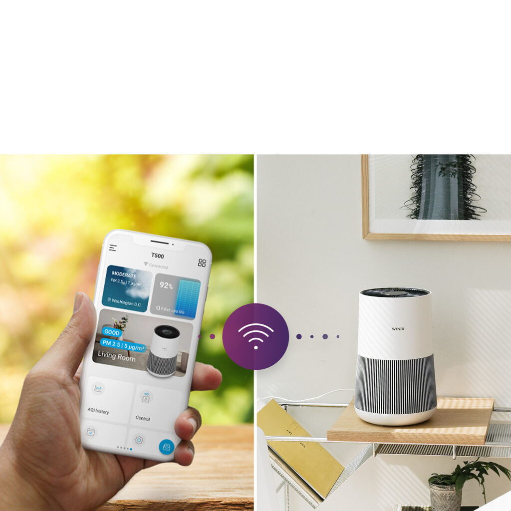T500はWi-Fi機能を搭載し、専用アプリ「Winix Smart」で自宅の空気清浄機をどこからでも操作できます。外出中でも運転ON/OFFやモード変更、フィルター状態の確認が可能。お子様やペットがいる家庭でも安心して空気環境を管理できます。IoT家電として、暮らしに寄り添う利便性を備えています。